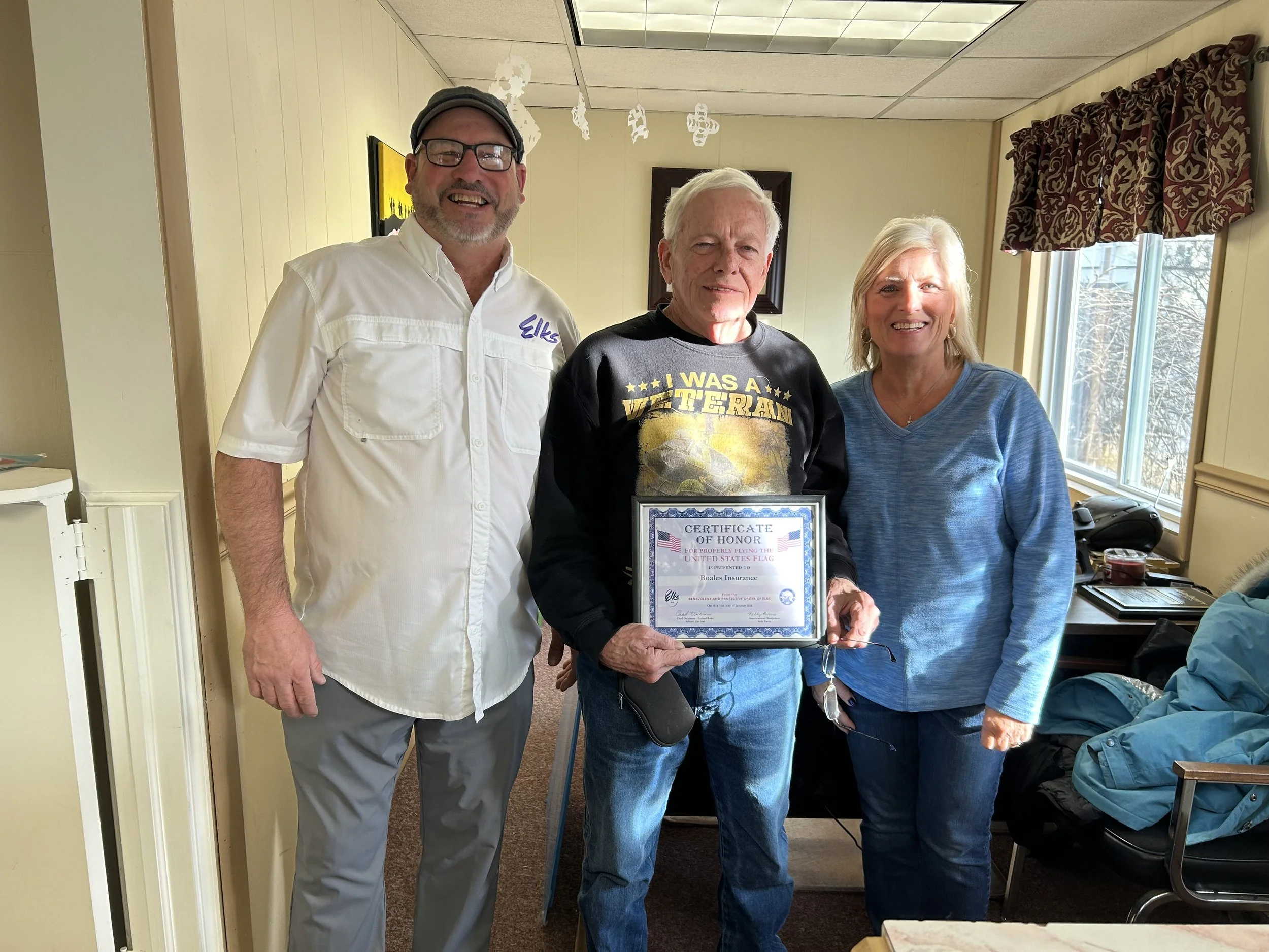 Ashland lodge 1360 Americanism Chairman Kelly Purvis and ER Chad Dickinson presented certificates to member Keith Boales of Boales Insurance and the Ashland Public Library for properly “Flying the Flag”